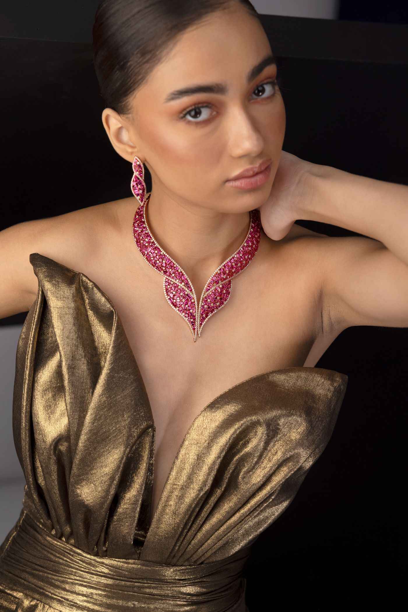 The Mediterranea Necklace captures this very essence. With 306meticulously custom-cut Pink Spinels, each uniquely shaped into five distinct designs, it mirrors the multifaceted beauty of theMediterranean Sea. Collectively weighing a staggering 91.76 carats, these gems reflect the sun'sdance upon the gentle waves, a spectrum of pink hues that range from the soft blush of dawn tothe fiery magenta of sunset.